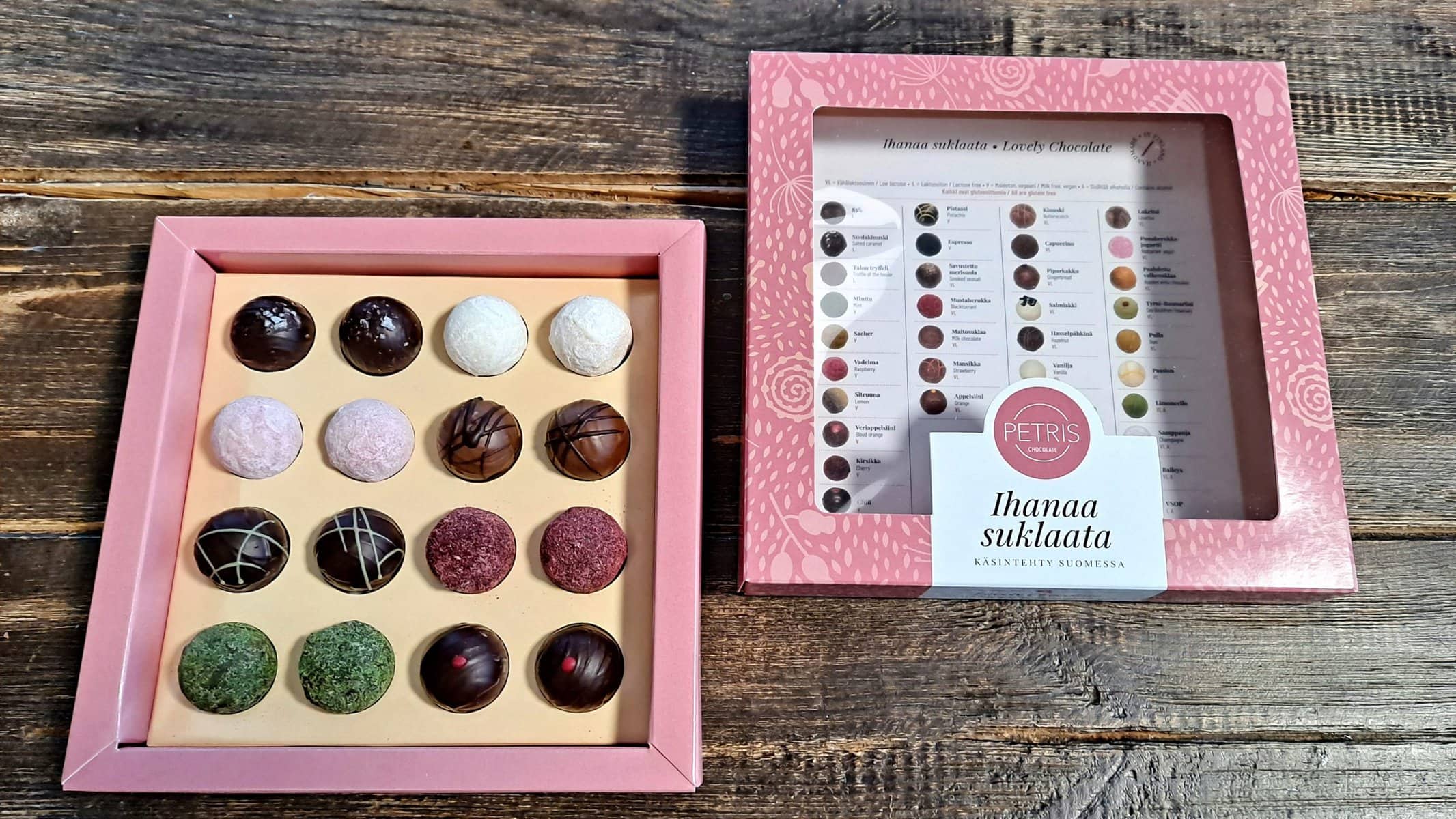 Suklaapraliiniemme valmistuksessa käytetään tuoretta kermaa, aitoja marjoja sekä hedelmiä, tästä johtuen niiden säilyvyysaika on 4-7 viikkoa postituspäivästä.