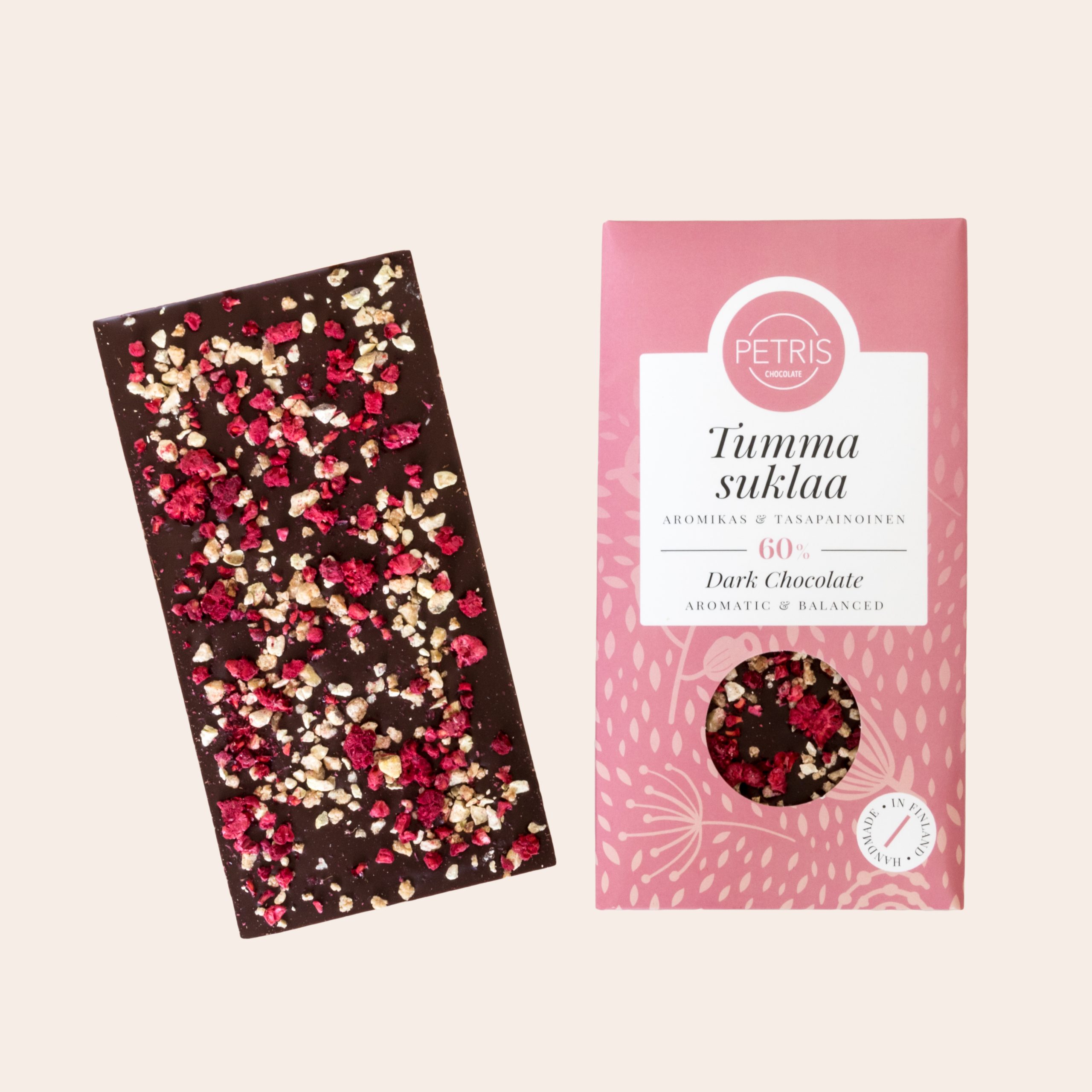 Kotimainen pakastekuivattu vadelma, pistaasipähkinä.